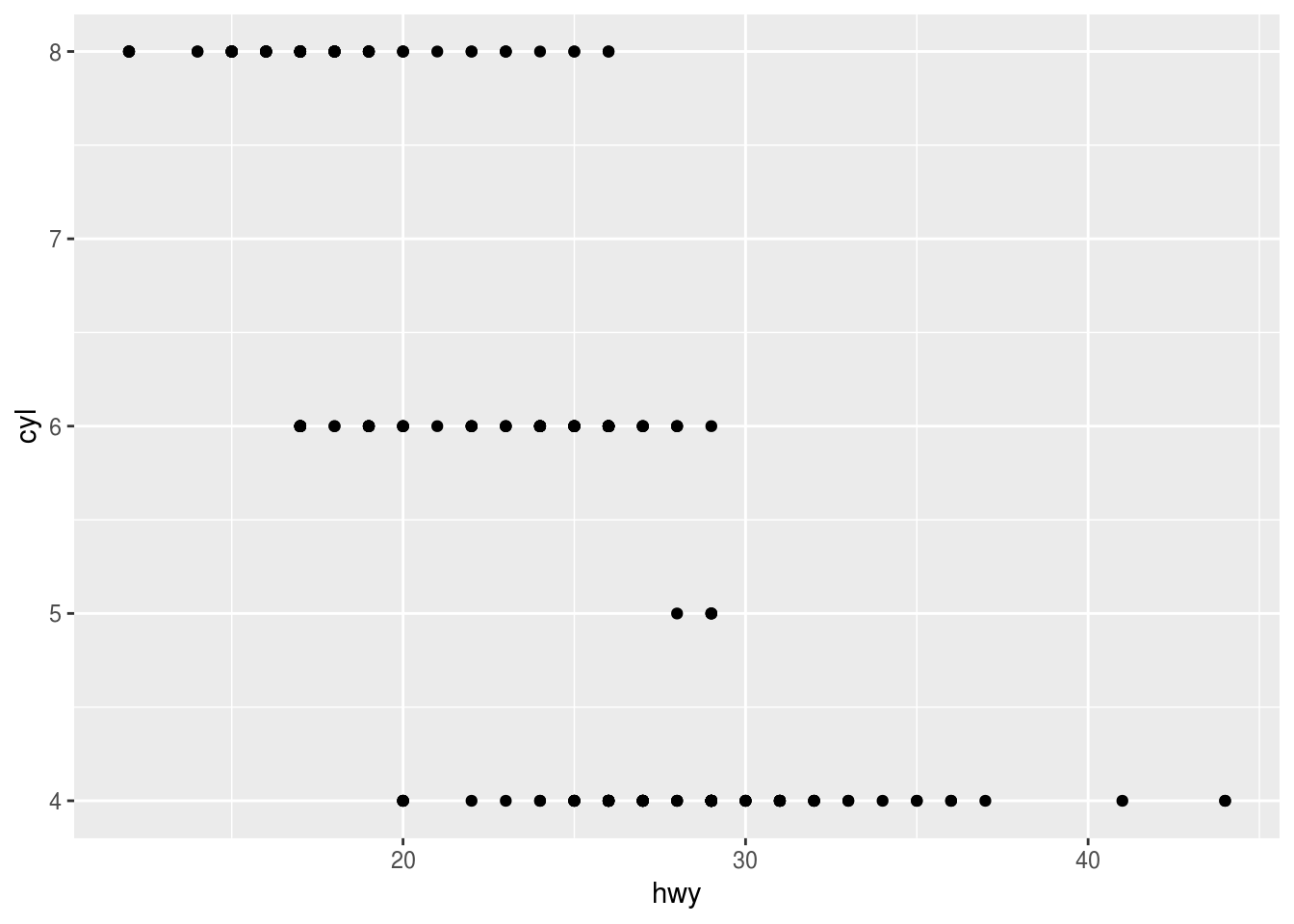 mean? How do they relate to this plot?ggplot(data = mpg) + geom_point(mapping = aes(x = drv, y = cyl))