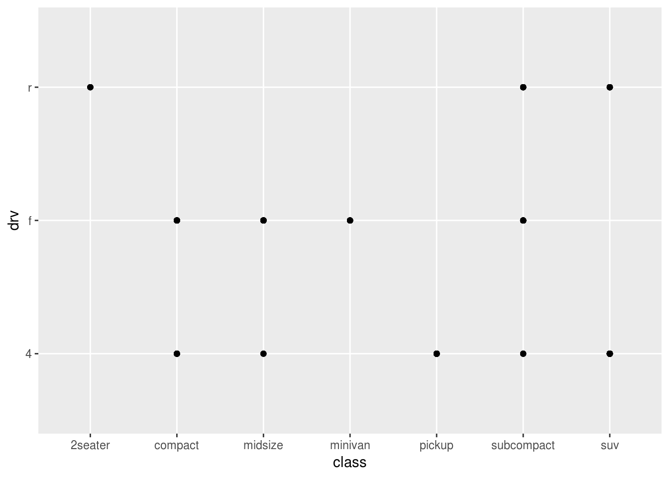 ? Why is the plot not useful?ggplot(mpg) + geom_point(aes(class, drv))