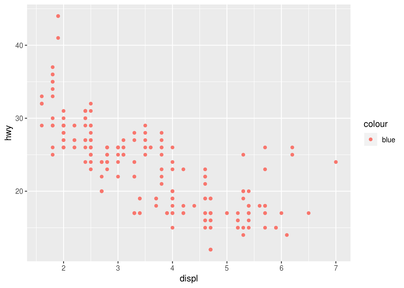 ggplot(data = mpg) + geom_point(mapping = aes(x = displ, y = hwy, color = "blue"))