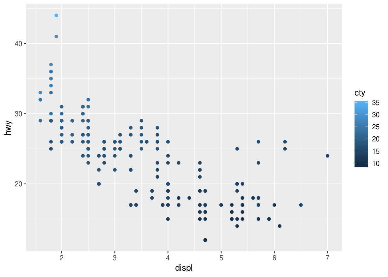 ggplot(mpg) + geom_point(aes(displ, hwy, color = cty))