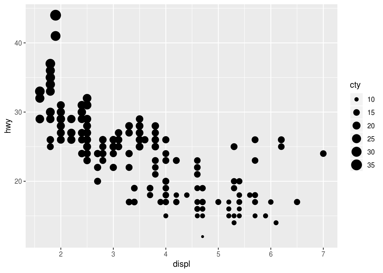 ggplot(mpg) + geom_point(aes(displ, hwy, size = cty))