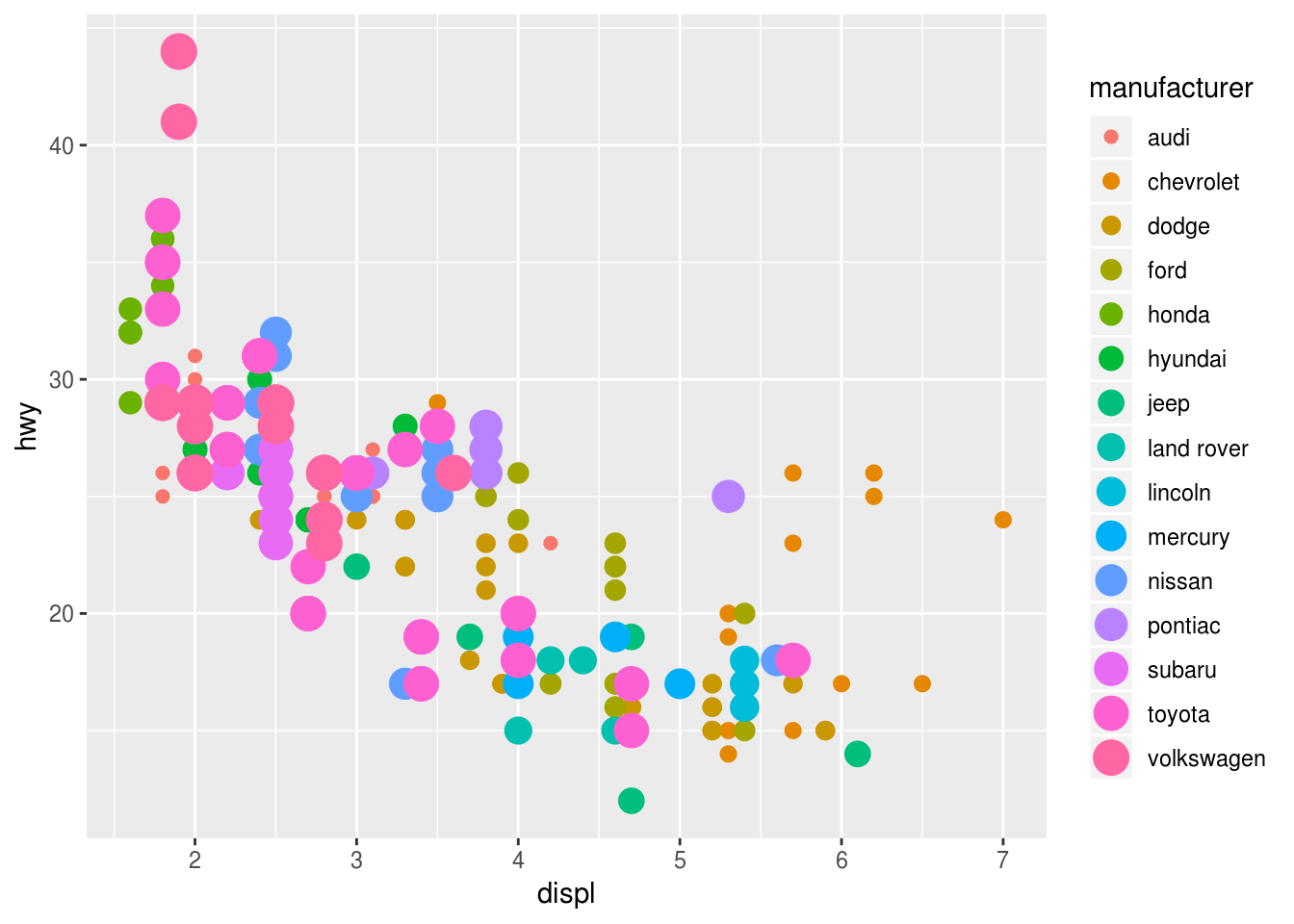 ggplot(mpg) + geom_point(aes(displ, hwy, color = manufacturer, size = manufacturer))