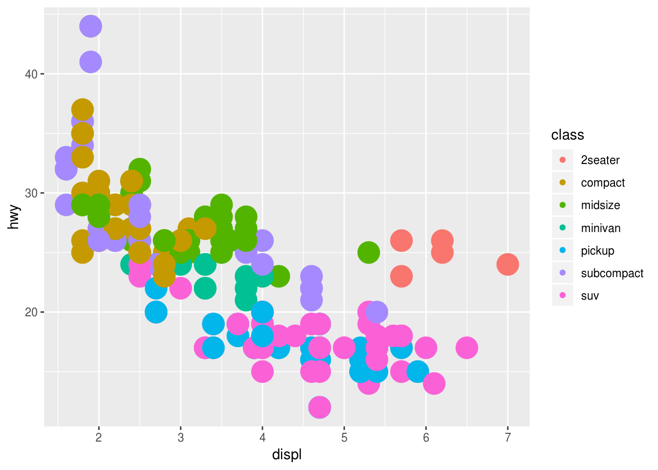 ggplot(mpg) + geom_point(aes(displ, hwy, color = class, stroke = 5))