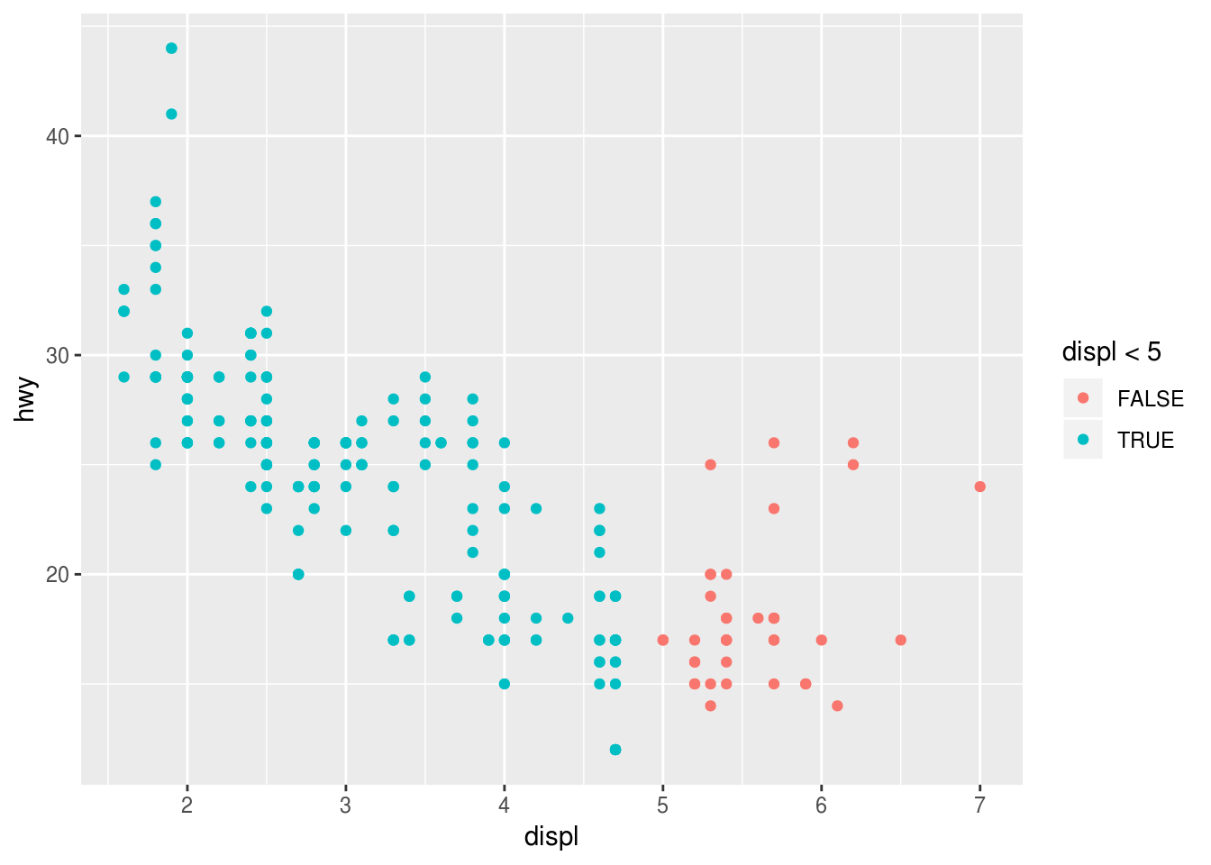 ? Note, you’ll also need to specify x and y.ggplot(mpg) + geom_point(aes(displ, hwy, color = displ < 5))