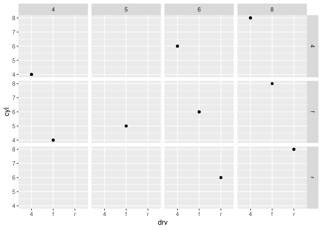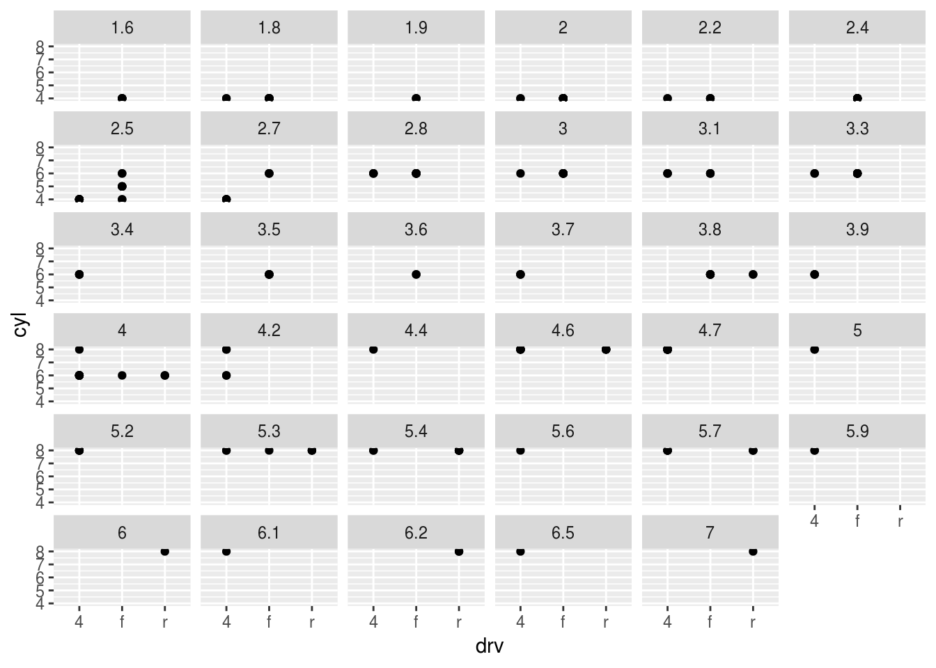 ggplot(data = mpg) + geom_point(mapping = aes(x = drv, y = cyl)) + facet_grid(drv ~ cyl)