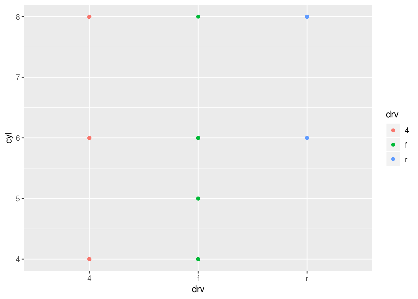 ggplot(data = mpg) + geom_point(mapping = aes(x = drv, y = cyl, color = drv))