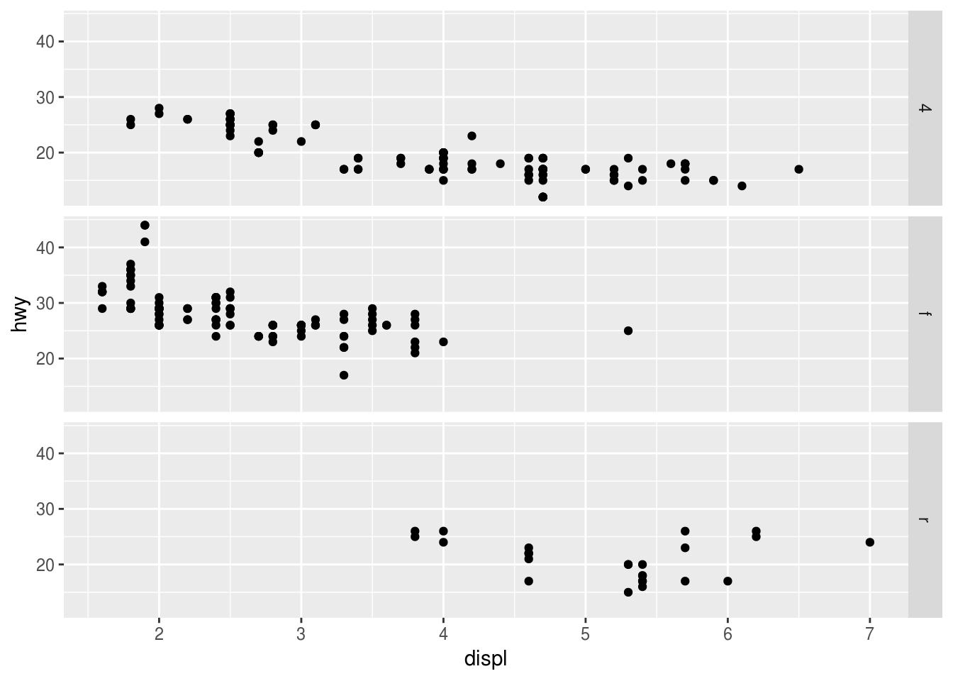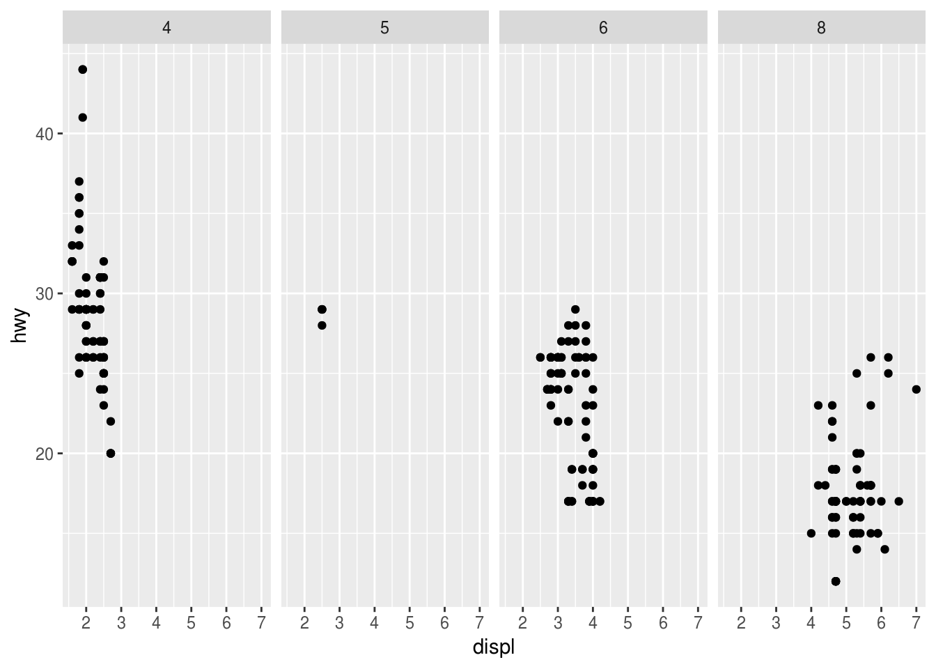 ggplot(data = mpg) + geom_point(mapping = aes(x = displ, y = hwy)) + facet_grid(drv ~ .) ggplot(data = mpg) + geom_point(mapping = aes(x = displ, y = hwy)) + facet_grid(. ~ cyl)
