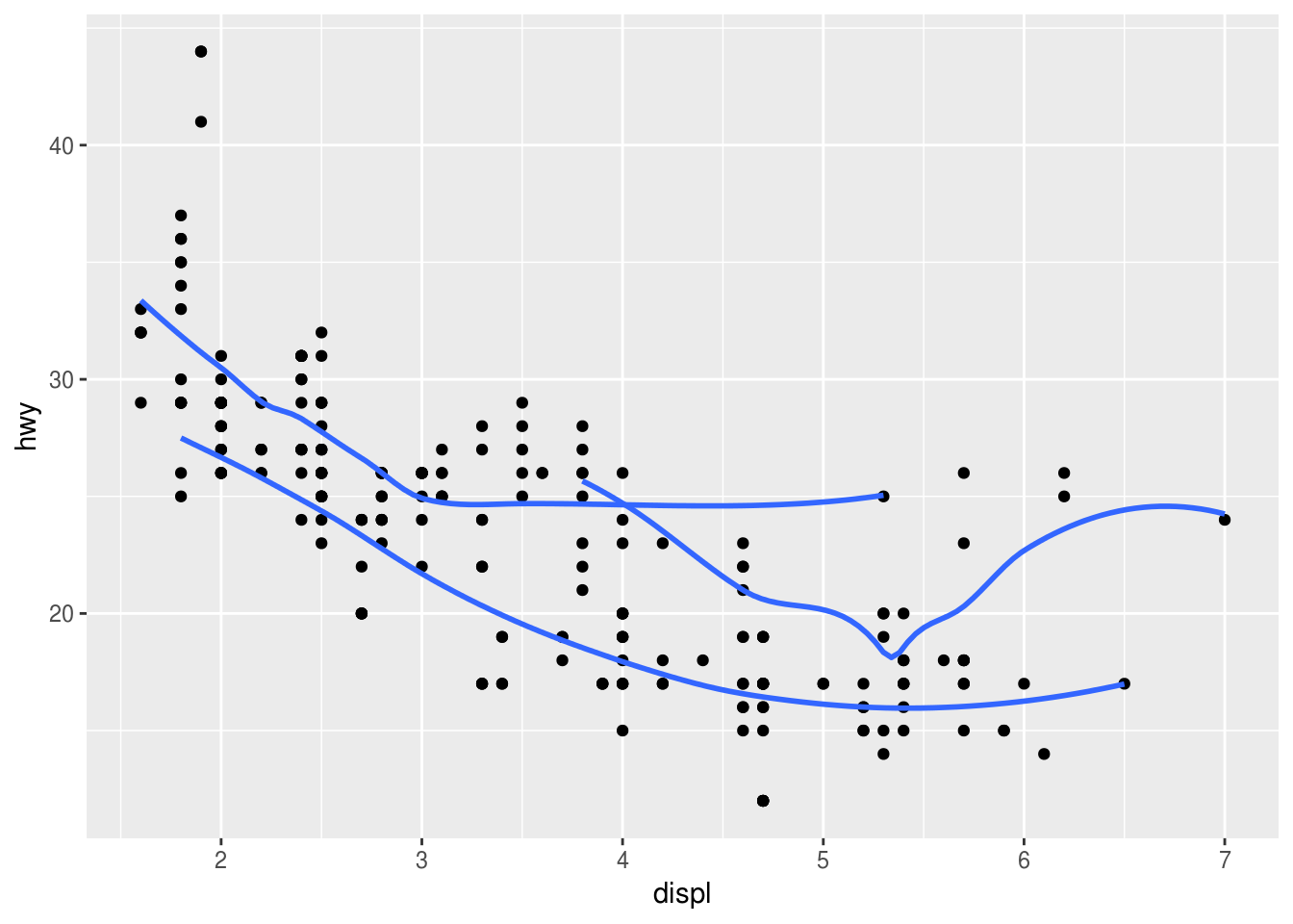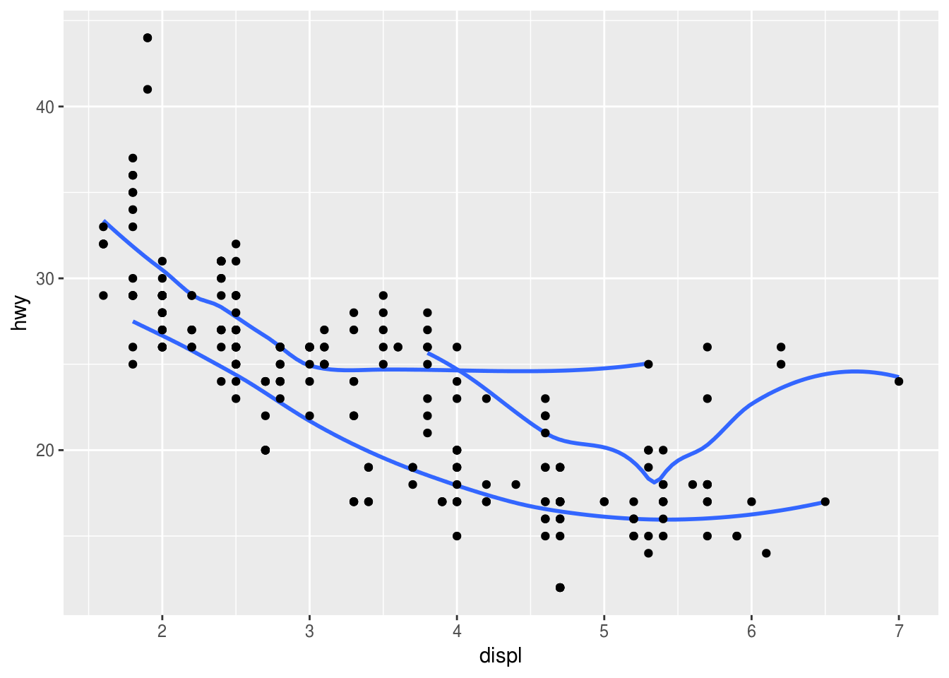 ggplot(data = mpg, mapping = aes(x = displ, y = hwy)) + geom_point() + geom_smooth() ggplot() + geom_point(data = mpg, mapping = aes(x = displ, y = hwy)) + geom_smooth(data = mpg, mapping = aes(x = displ, y = hwy))