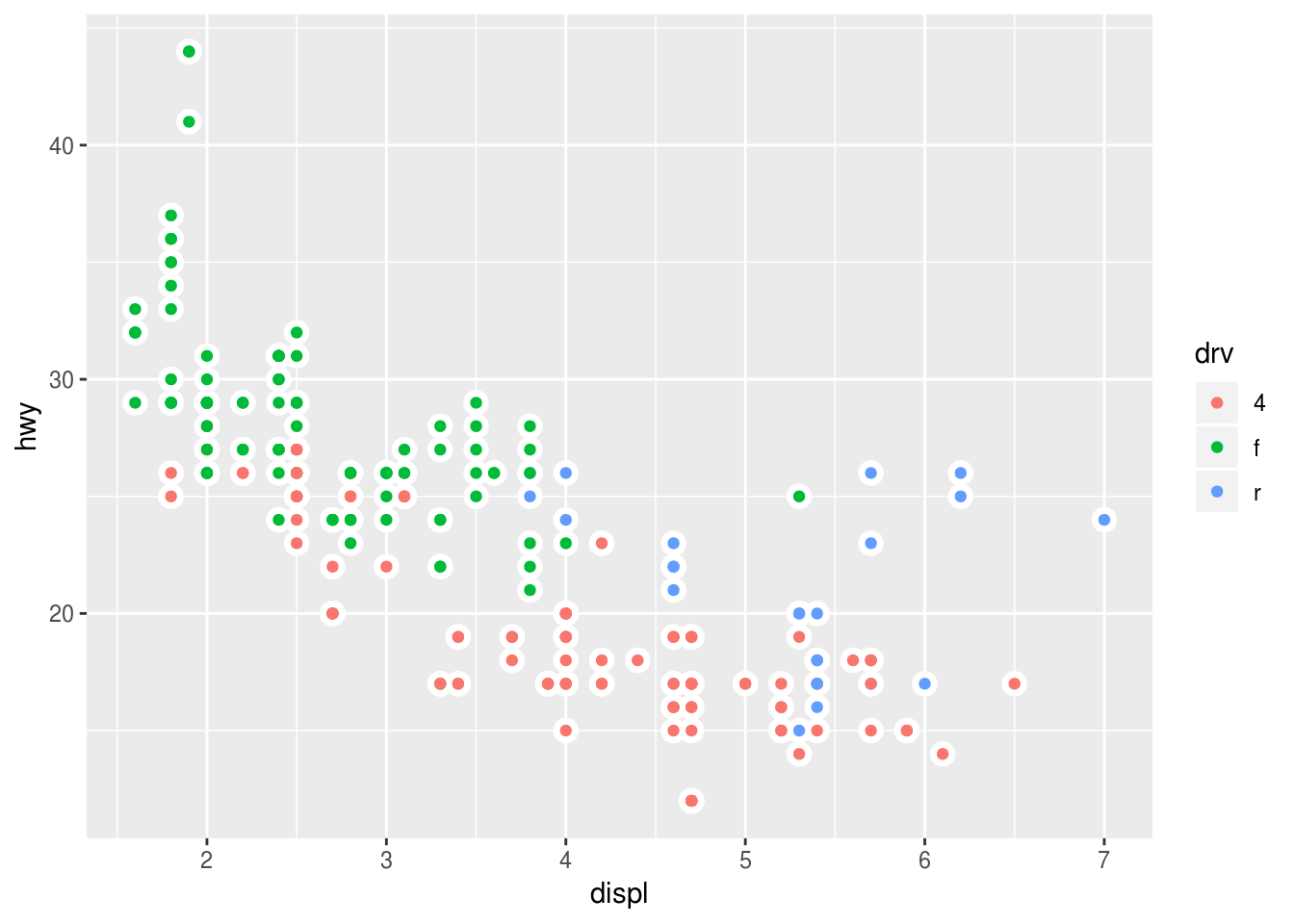 ### (6) ggplot(data = mpg, mapping = aes(x = displ, y = hwy)) + geom_point(color = 'white', size =4) + geom_point(mapping = aes(color = drv))