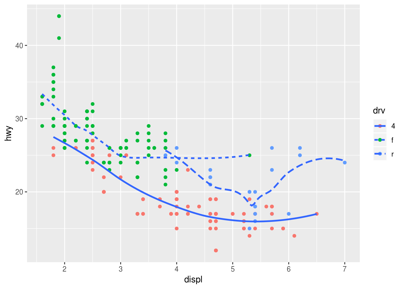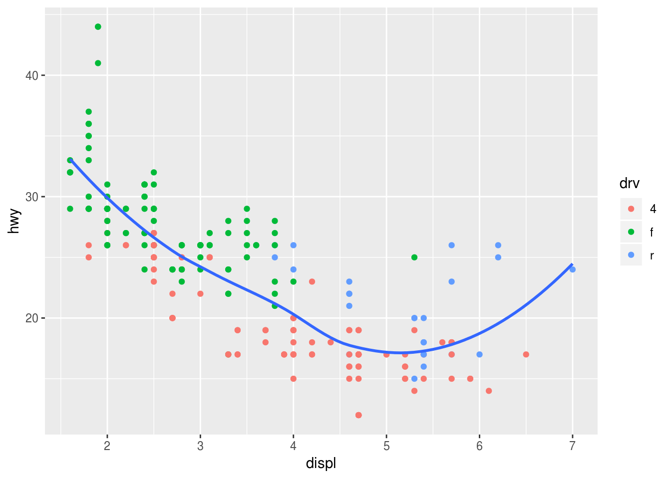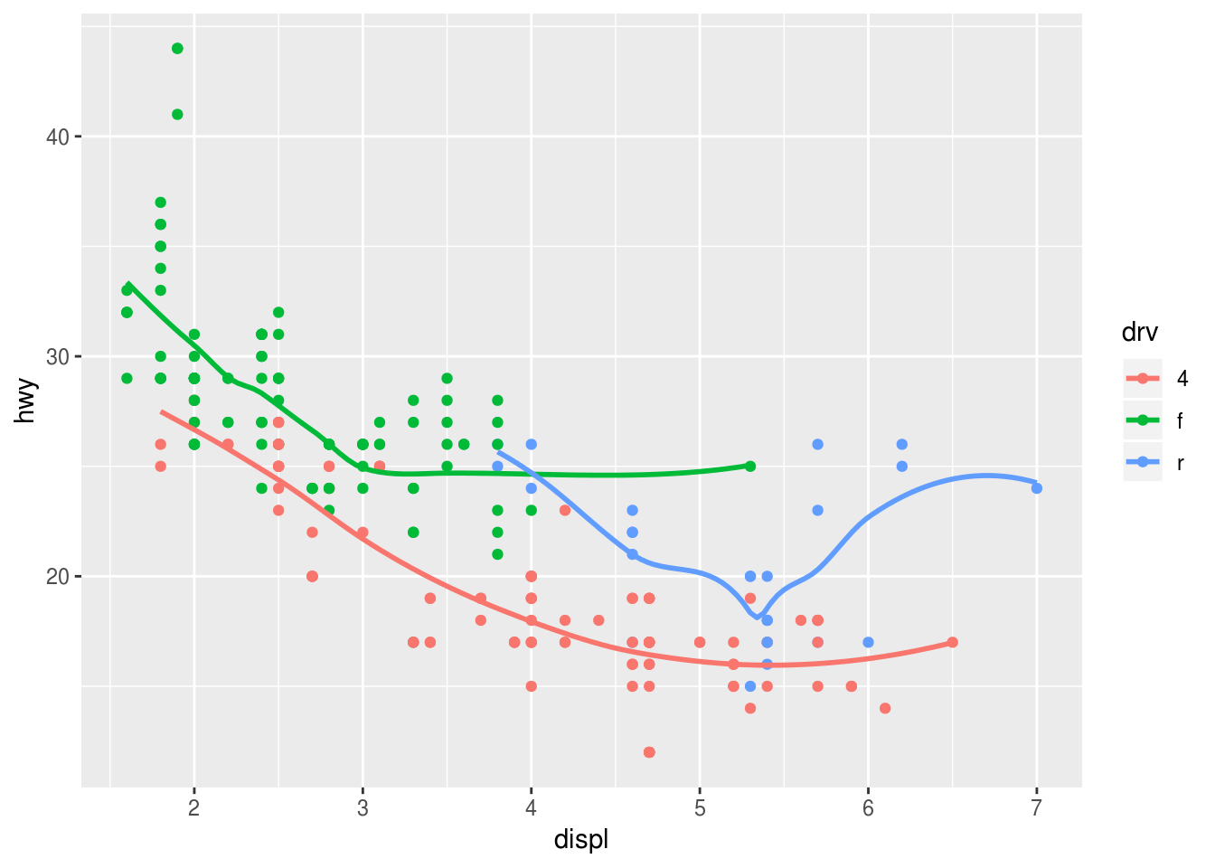 ggplot(data = mpg, mapping = aes(x = displ, y = hwy, color = drv)) + geom_point() + geom_smooth(se = FALSE)