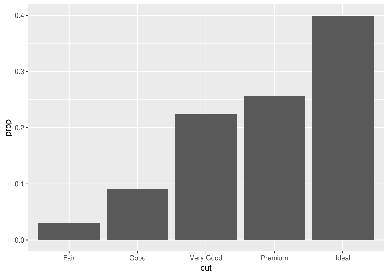 ggplot(data = diamonds) + geom_bar(mapping = aes(x = cut, y = ..prop.., group = 1))