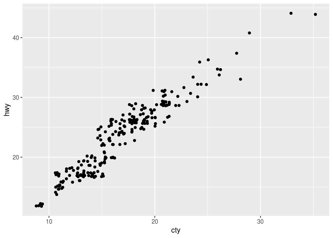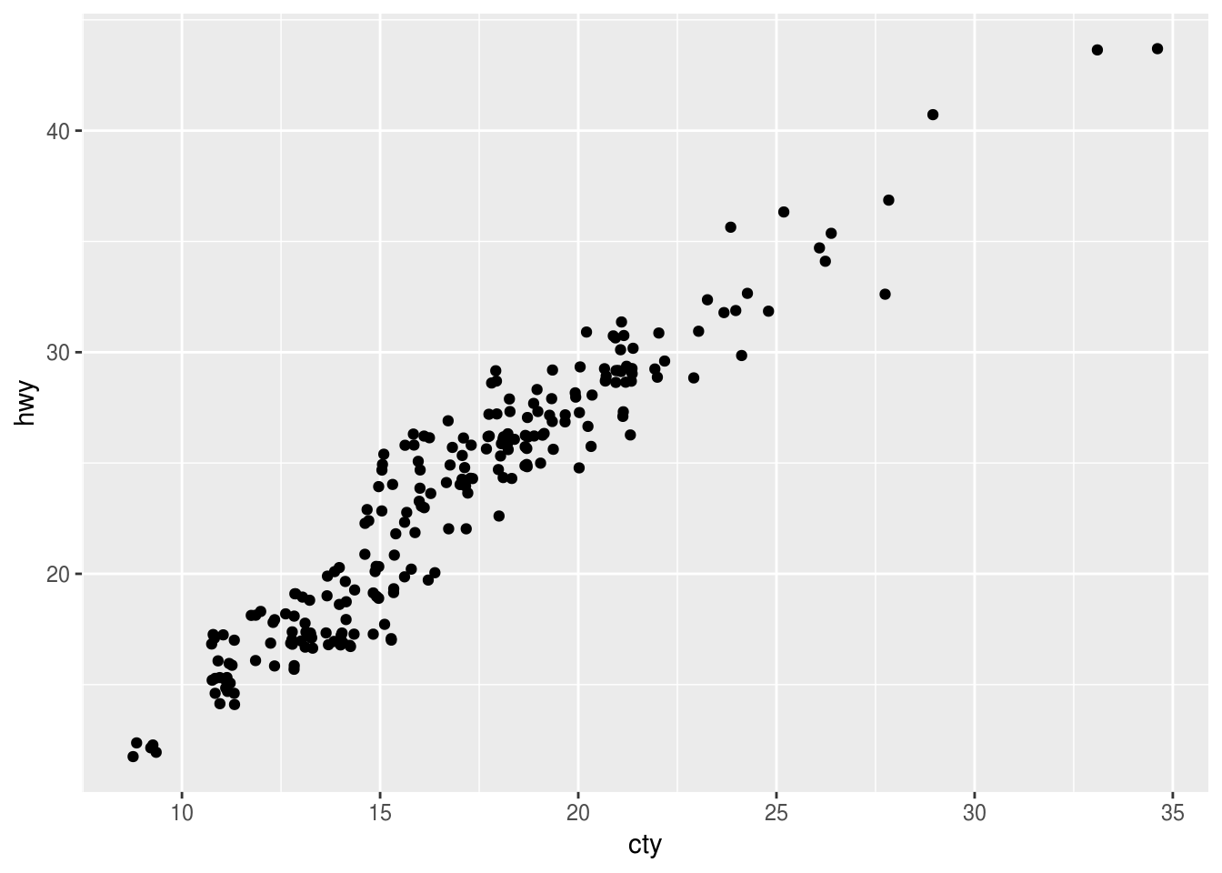 ggplot(data = mpg, mapping = aes(x = cty, y = hwy)) + geom_point()