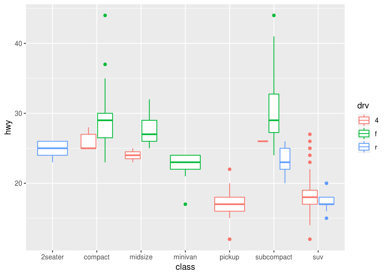 ggplot(data = mpg, mapping = aes(x = class, y = hwy, color = drv)) + geom_boxplot()