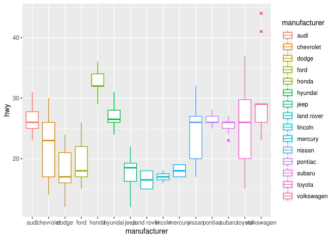 ggplot(data = mpg, mapping = aes(x = manufacturer, y = hwy, color = manufacturer)) + geom_boxplot()