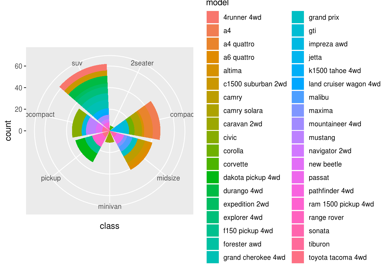 .ggplot(data = mpg) + geom_bar(mapping = aes(x = class, y = stat(count), fill = model)) + coord_polar()