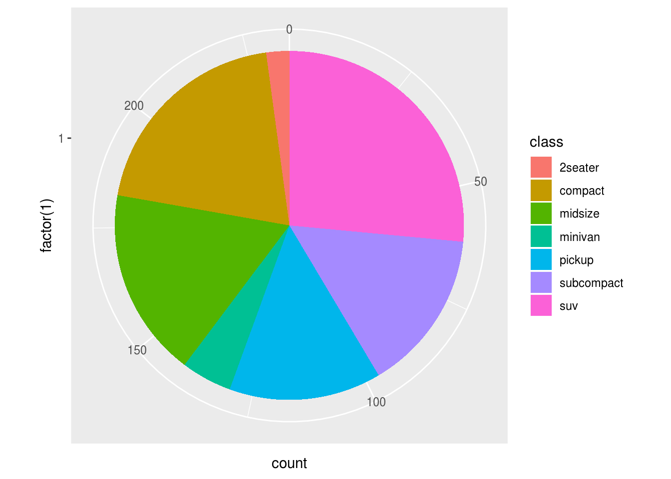 ggplot(data = mpg, mapping = aes(x = factor(1), fill = class)) + geom_bar(width = 1) + coord_polar(theta = "y")