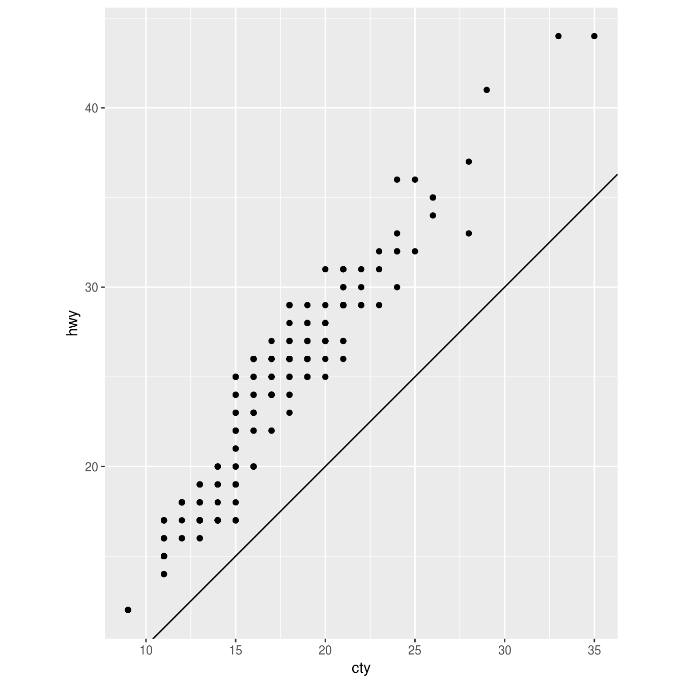 do?ggplot(data = mpg, mapping = aes(x = cty, y = hwy)) + geom_point() + geom_abline() + coord_fixed()